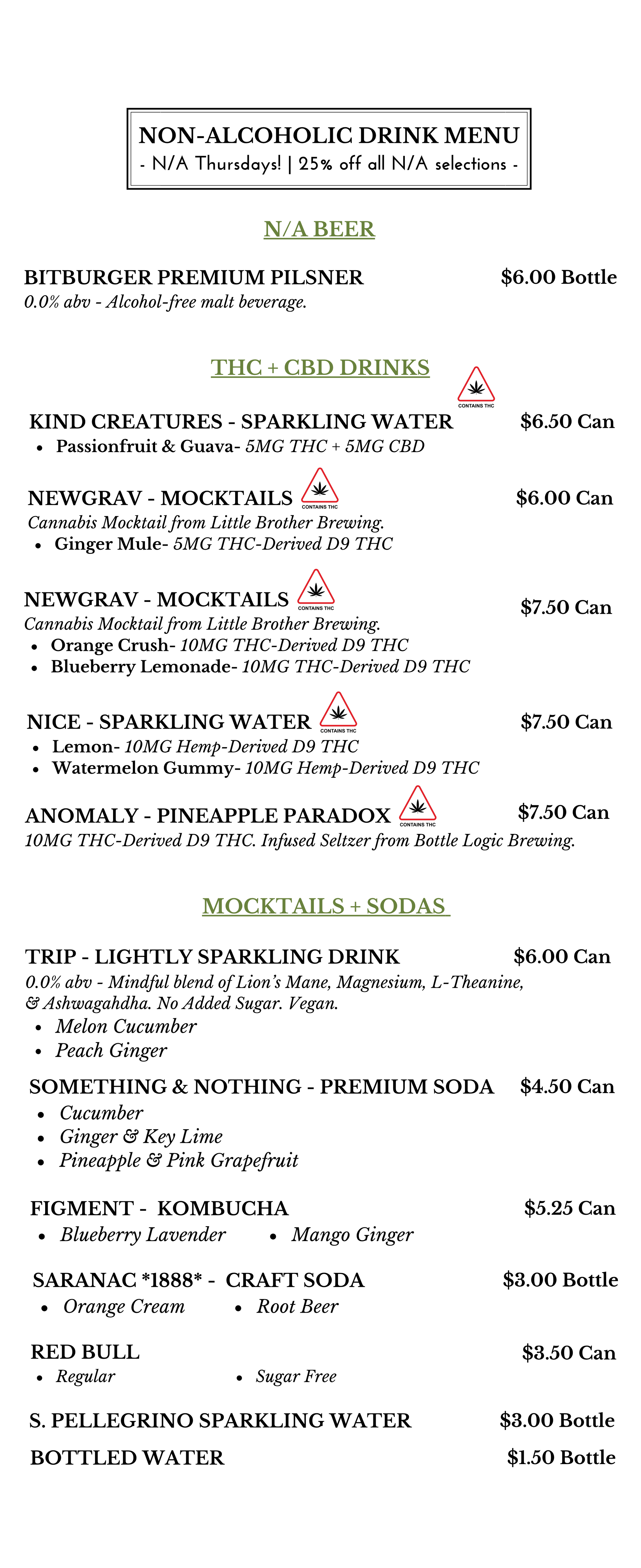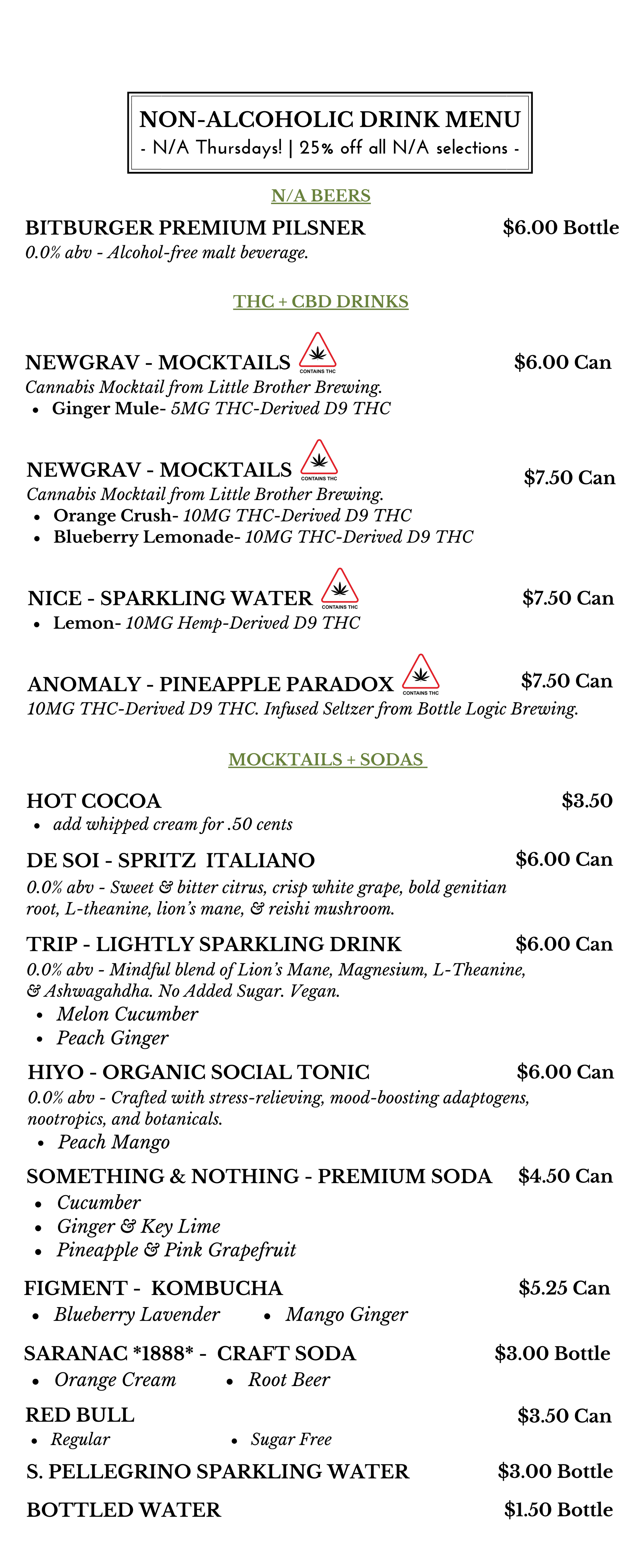 ABOUT HAPPENINGS BEER LIST/WINE LIST N/A BEVERAGES TO-GO MENU Merchandise/Gift Card CONTACT US